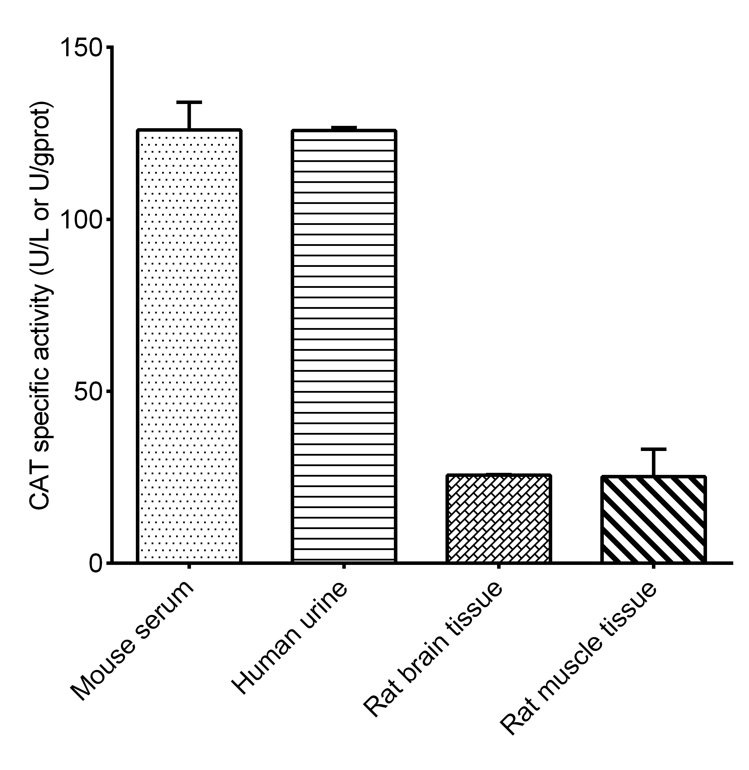 - Catalase can decompose H2O2 to generate H2O and O2, the residual H2O2 in the detection system react with the fluorescent substance, and the content of residual H2O2 is proportional to the fluorescence intensity at the excitation wavelength of 535 nm and emission wavelength of 587 nm, the catalase activity is inversely proportional to the fluorescence intensity.