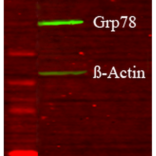 - GRP78 is a ubiquitously expressed, 78-kDa glucose regulated protein, and is commonly referred to as an immunoglobin chain binding protein (BiP). The BiP proteins are categorized as stress response proteins because they play an important role in the proper folding and assembly of nascent protein and in the scavenging of misfolded proteins in the endoplasmic reticulum lumen. Translation of BiP is directed by an internal ribosomal entry site (IRES) in the 5' non-translated region of the BiP mRNA. BiP IRES activity increases when cells are heat stressed (1). GRP78 is also critical for maintenance of cell homeostasis and the prevention of apoptosis (2). Luo et al. have provided findings that suggest GRP78 is essential for embryonic cell growth and pluripotent cell survival (3). In terms of diseases, GRP78 has been shown to be a reliable biomarker of hypoglycemia, to serve a neuroprotective function in neurons exposed to glutamate and oxidative stress (4), and its protein levels are reduced in the brains of Alzheimer's patients (5). Also, the induction of the GRP78 protein that results in severe glucose and oxygen deprivation could possible lead to drug resistance to anti-tumor drugs (6, 7).