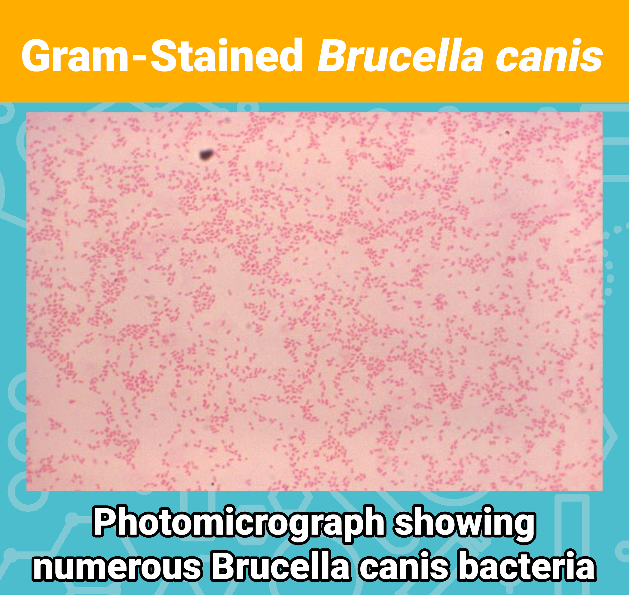 Brucella canis is a Gram-negative bacterium responsible for canine brucellosis, a reproductive disease that causes veterinarians, pet owners and the public a plethora of health issues and concerns. Unlike many illnesses in dogs, B. canis is bacterial and largely affects the reproductive system, leading to infertility, late-term abortion in females, and testicular inflammation in males. It is transmitted through reproductive fluids, aborted foetuses, and contaminated materials. A key issue is that infected dogs frequently appear clinically normal allowing the disease to go unnoticed, causing significant issues in kennels and areas where canines are in close proximity of each other.