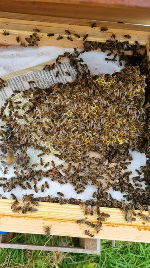 October: Our bee’s decided to ‘beard’ at the bottom of the hive and had started to produce comb, so we made the decision as autumn was approaching to remove the beard and place them all into the top of the hive. This was a successful decision.