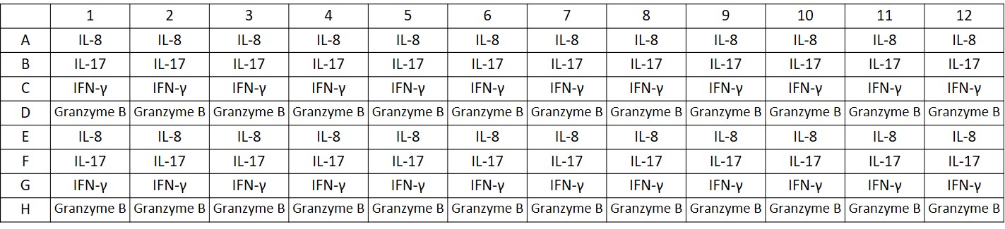 - IL17A; Interleukin 17A; IL-17A; IL-17; CTLA8; IL17; Interleukin 17 (Cytotoxic T-Lymphocyte-Associated Serine Esterase 8); Cytotoxic T-Lymphocyte-Associated Protein 8; Cytotoxic T-Lymphocyte-Associated Antigen 8CXCL8; C-X-C Motif Chemokine Ligand 8; MDNCF; NAP-1; MONAP; GCP-1; Monocyte-Derived Neutrophil Chemotactic Factor; Monocyte-Derived Neutrophil-Activating Peptide; Granulocyte Chemotactic Protein 1; Chemokine (C-X-C Motif) Ligand 8; SCYB8; LYNAP; LUCT; LECT; IL-8; GCP1; NAP1; NAF; IL8; Beta Endothelial Cell-Derived Neutrophil Activating Peptide IFN gamma: IFNG; Interferon Gamma; Immune Interferon; IFN-Gamma; IMD69; IFG; IFIGranzyme B: GZMB; Granzyme B; CTSGL1; CGL1; SECT; HLP; T-Cell Serine Protease 1-3E; Cathepsin G-Like 1; CGL-1; CSP-B; CTLA1; CCPI; CSPB; Granzyme B (Granzyme 2, Cytotoxic T-Lymphocyte-Associated Serine Esterase 1); Cytotoxic T-Lymphocyte Proteinase 2; Cytotoxic Serine Protease B; Human Lymphocyte Protein; Fragmentin 2; EC 3.4.21.79; C11; Cytotoxic T-Lymphocyte-Associated Serine Esterase 1; Lymphocyte Protease; Fragmentin-2; Granzyme 2; Granzyme-2; EC 3.4.21; CTLA-1; GRB