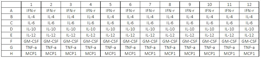 - GM-CSF: CSF2; Colony Stimulating Factor 2; GMCSF; Sargramostim; GM-CSF; Colony Stimulating Factor 2 (Granulocyte-Macrophage); Granulocyte-Macrophage Colony-Stimulating Factor; Molgramostim; Molgramostin; CSF; Granulocyte-Macrophage Colony Stimulating Factor; Granulocyte Macrophage-Colony Stimulating Factor; Colony-Stimulating FactorIFN gamma: IFNG; Interferon Gamma; Immune Interferon; IFN-Gamma; IMD69; IFG; IFIIL4: IL4; Interleukin 4; IL-4; Lymphocyte Stimulatory Factor 1; BCGF-1; BCGF1; BSF1; B_cell Stimulatory Factor 1; B Cell Growth Factor 1; Interleukin-4; Binetrakin; Pitrakinra; MGC79402; BSF-1; B-Cell Stimulatory Factor 1IL6: IL6; Interleukin 6; IL-6; IFNB2; BSF2; HGF; HSF; B-Cell Stimulatory Factor 2; CTL Differentiation Factor; Hybridoma Growth Factor; Interferon Beta-2; Interleukin-6; IFN-Beta-2; BSF-2; CDF; Interleukin 6 (Interferon, Beta 2); B-Cell Differentiation Factor; Interferon, Beta 2; Interleukin BSF-2IL10: IL10; Interleukin 10; IL-10; CSIF; Cytokine Synthesis Inhibitory Factor; IL10A; TGIF; T-Cell Growth Inhibitory Factor; Interleukin-10; GVHDSIL12: IL12A; Interleukin 12A; IL-12A; NKSF1; CLMF; NFSK; P35; Interleukin 12A (Natural Killer Cell Stimulatory Factor 1, Cytotoxic Lymphocyte Maturation Factor 1, P35); Cytotoxic Lymphocyte Maturation Factor 35 KDa Subunit; Cytotoxic Lymphocyte Maturation Factor 1, P35; NF Cell Stimulatory Factor Chain 1; NK Cell Stimulatory Factor Chain 1; Interleukin-12 Subunit Alpha; Interleukin-12 Alpha Chain; Interleukin 12, P35; IL-12, Subunit P35; IL35 Subunit; CLMF P35; Natural Killer Cell Stimulatory Factor 1, 35 KD Subunit ; IL-12 Subunit P35MCP1: CCL2; C-C Motif Chemokine Ligand 2; MCP-1; MCP1; MCAF; HC11; Monocyte Chemotactic And Activating Factor; Monocyte Secretory Protein JE; SMC-CF; GDCF-2; SCYA2; Small Inducible Cytokine A2 (Monocyte Chemotactic Protein 1, Homologous To Mouse Sig-Je); Small Inducible Cytokine Subfamily A (Cys-Cys), Member 2; Monocyte Chemoattractant Protein-1; Chemokine (C-C Motif) Ligand 2; Monocyte Chemotactic Protein 1; Small-Inducible Cytokine A2; C-C Motif Chemokine 2; MGC9434; Monocyte Chemotactic Protein 1, Homologous To Mouse Sig-Je; Monocyte Chemoattractant Protein 1; HSMCR30TNF alpha: TNF; Tumor Necrosis Factor; TNF-Alpha; TNFSF2; TNFA; DIF 2; Tumor Necrosis Factor Ligand Superfamily Member 2; TNF-A; Tumor Necrosis Factor (TNF Superfamily, Member 2); Tumor Necrosis Factor Ligand 1F; Tumor Necrosis Factor-Alpha; Tumor Necrotic Factor Alpha; TNF Superfamily, Member 2; TNF, Macrophage-Derived; TNF, Monocyte-Derived; APC1 Protein; Cachectin; TNLG1F