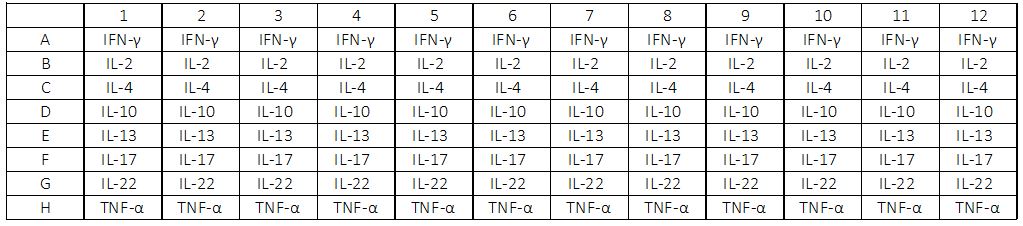 - IFN gamma: 15.6 - 500 pg/mlIL2: 31.25 - 1000 pg/mlIL4: 15.6 - 500 pg/mlIL10: 15.6 - 500 pg/mlIL13: 15.6 - 500 pg/mlIL17: 31.25 - 1000 pg/mlIL22: 15.6 - 500 pg/mlTNF alpha: 31.25 - 1000 pg/ml