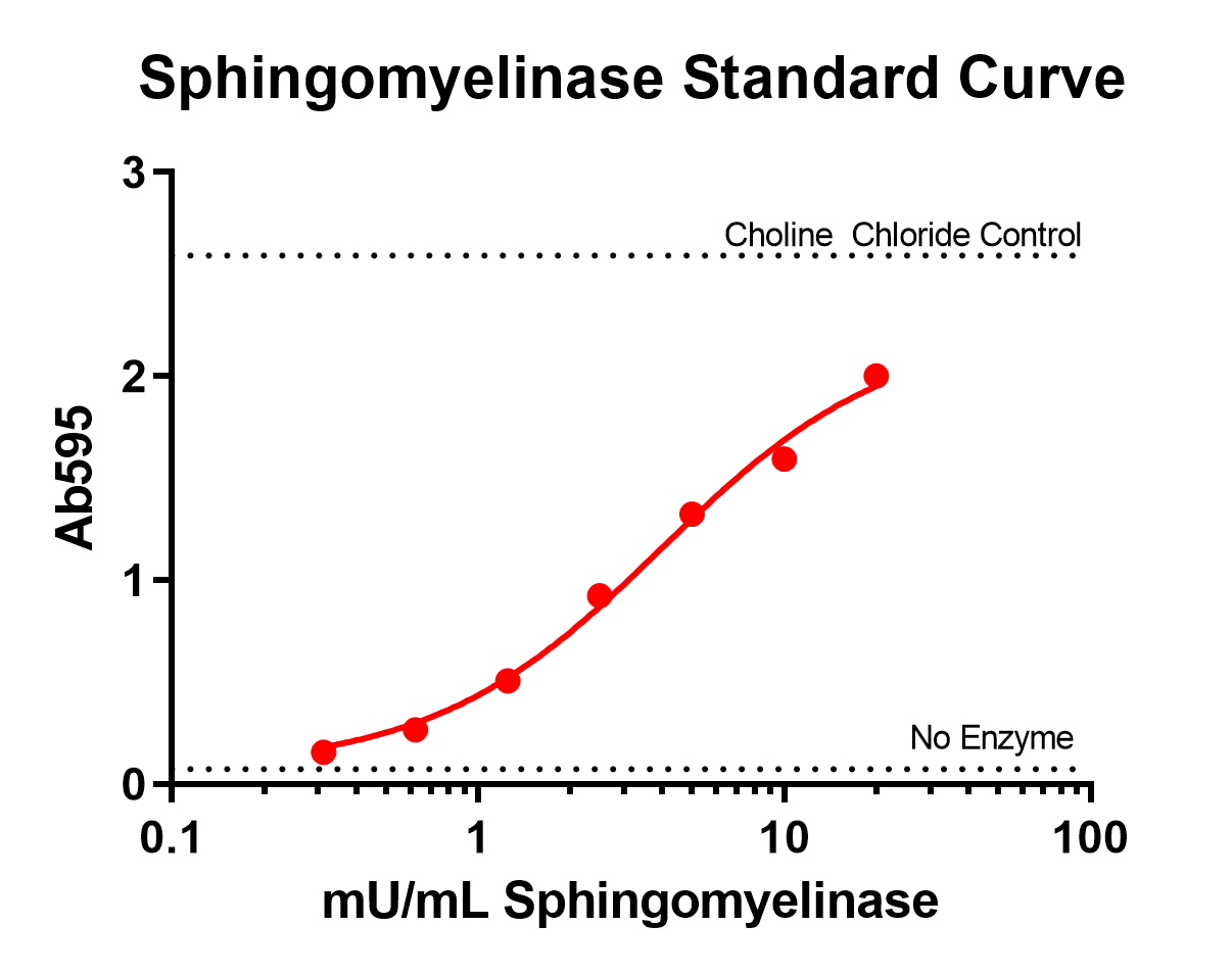 - The Neutral Sphingomyelinase Activity Assay kit is an enzyme coupled assay that measures sphingomyelinase activity in biological samples through the downstream production of choline.Assay Incubation time: 2-4 hoursAssay Range: 5 mU/mL - 0.078 mU/mLSample Type: tissue homogenates cell lysates serum saliva and urineProduct BackgroundThe Neutral Sphingomyelinase Activity Assay kit can detect sphingomyelinase at concentrations as small as 78 uU/mL. The kit provides all reagents to measure the Neutral Sphingomyelinase (nSMase) activity of 40 samples ran in duplicate.In this enzyme coupled assay N-SMase catalyzes the hydrolysis of sphingomyelin into phosphorylcholine and ceramide. Alkaline phosphatase then catalyzes phosphorylcholine to choline. Choline is them oxidized by Choline oxidase to form hydrogen peroxide. Finally DAOS plus 4-Aminoantipyrine (4 AAP) in the presence of hydrogen peroxide and peroxidase results in the oxidative coupling of DAOS and 4 AAP to form a blue chromogen that is detected by measuring the absorbance of light at 595 nm. Powered by Bioz See more details on Bioz