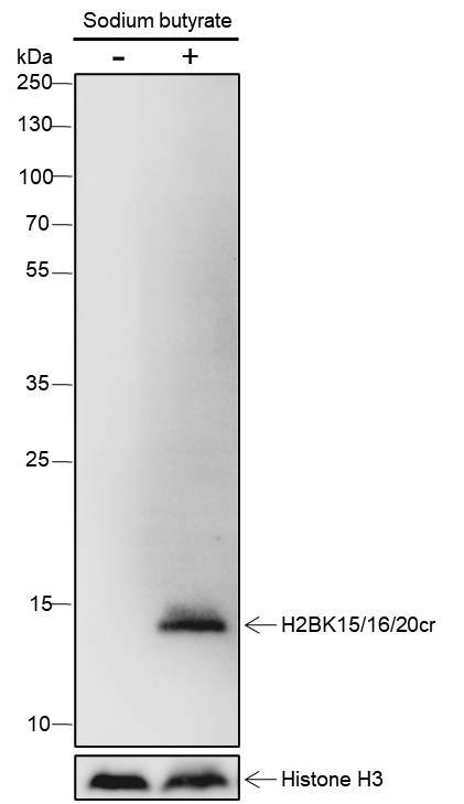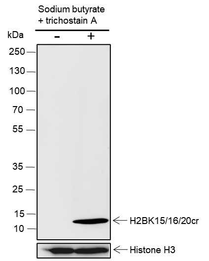 - Anti-Crotonyl-Histone H2B (Lys15/16/20) Rabbit mAb detects histone H2B when it is crotonylated at Lys15/16/20.