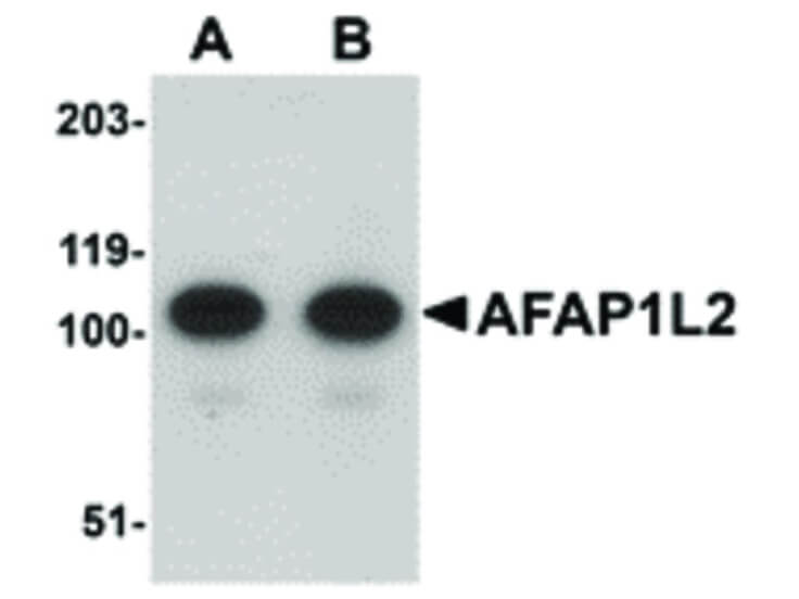 - Anti-AFAP1L2 antibody was prepared from whole rabbit serum produced by repeated immunizations with a 15 amino acid synthetic peptide near the C-terminus of human AFAP1L2.