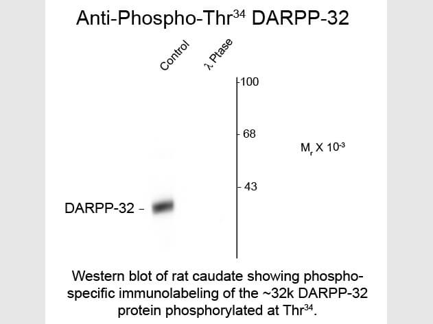 - Anti-DARPP-32 pT34 antibody is directed against DARPP-32. Anti-DARPP-32 pT34 antibody was prepared from monospecific antiserum by immunoaffinity chromatography using phospho peptide coupled to agarose beads followed by solid phase adsorption(s) against non-phospho peptide and non-specific peptide to remove any unwanted reactivities. Assay by immunoelectrophoresis resulted in a single precipitin ar