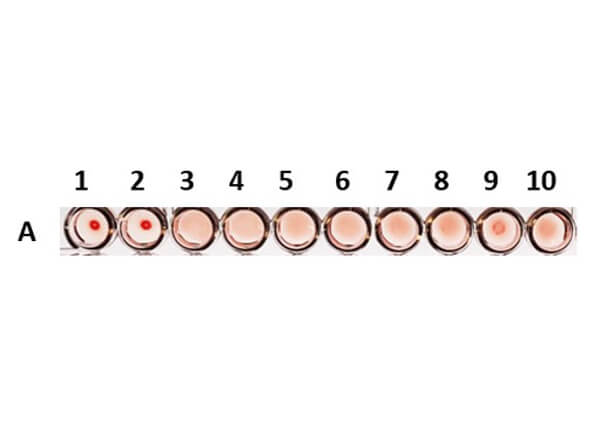 - Hemagglutination method is used for titer evaluation of viruses (e.g. Influenza, COVID-19 etc.), bacteria (e.g. Staphylococci, Shigella etc.), proteins (e.g. certain glycoproteins such as Lectins) and other agents which have the ability to attach to red blood cells (RBC)'s surface molecules. For example, the influenza viruses agglutinate RBCs through their interaction with sialic acid receptors on the host cells. At a molecular level, viral hemagglutinins bind to sialic acid linked to galactose residues through alpha 2.3 or 2.6 linkage, which varies from species to species. Once a hemagglutinin agglutinates the RBCs, each of the agglutinating molecule attaches to RBCs to form a lattice-structure or a meshwork. This prevents RBCs from settling down from suspension in a round bottom 96 well plate. Visually, a hemagglutinated sample will generate a uniform red colored suspension while a sample lacking hemagglutination will lead to settling down of RBCs to the bottom of wells to form button or dot shape. In viral hemagglutination assay, a virus dilution (e.g. 2-fold from 1:4 to 1:4096) will be applied to an RBC dilution (e.g. 0.05% -0.1%) for 30 minutes to an hour at room temperature or 4° C. Thereafter, lattice formation is observed and the titer of a hemagglutination assay can be determined by the last viable "lattice" structure found. If diluted further, the amount of Virus particles will be less than the RBCs and thus not be able to agglutinate them. A Hemagglutination-inhibition (HAI) assay will involve titration of the viral hemagglutination with an anti-viral antibody (often from serum of human or animal infected with that virus) for inhibition of hemagglutination (i.e. neutralization of virus). HAI is one of the most commonly used methods to quantify immunity from influenza and other respiratory viral disease vaccines and is considered the gold standard as a correlate of vaccination mediated protection.