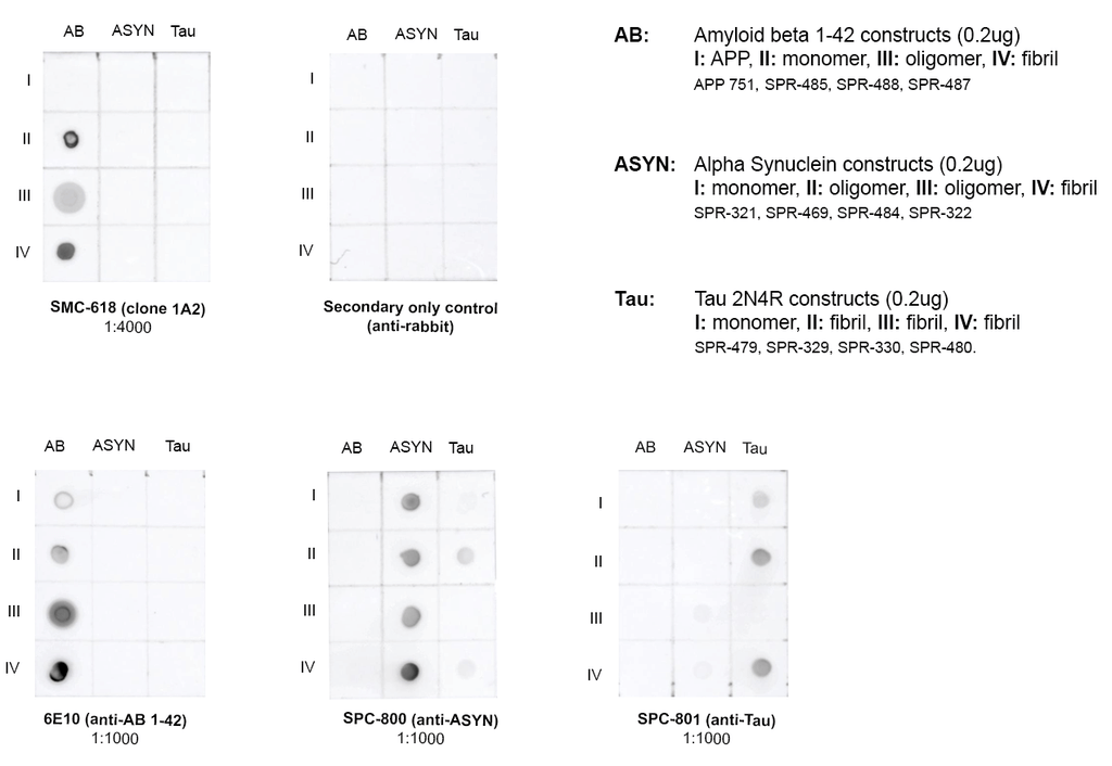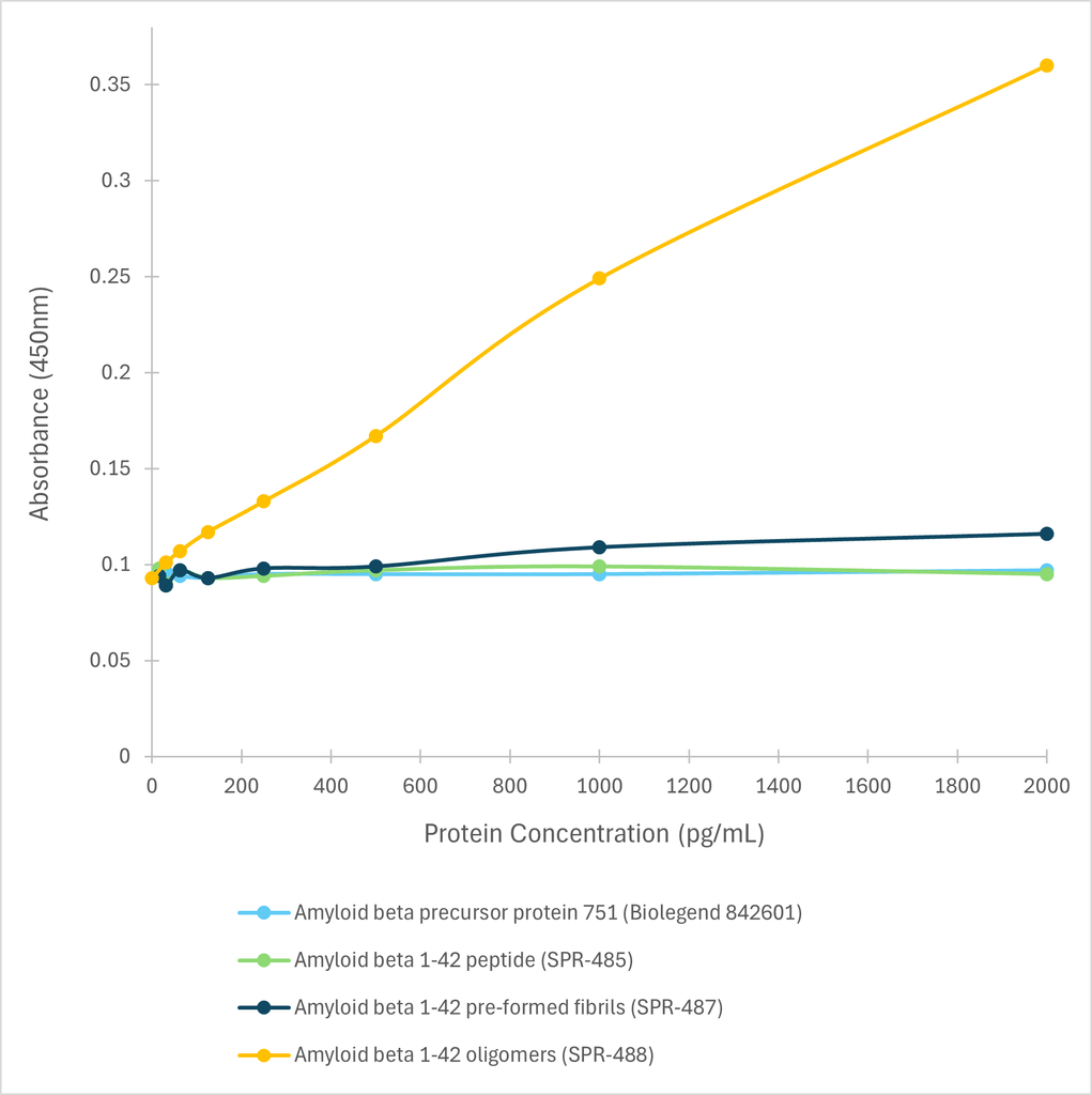 - Amyloid beta (AB Beta) peptide, particularly the 1-42 isoform (AB Beta1-42), plays a central role in the pathogenesis of Alzheimer's disease (AD). AB Beta is generated through proteolytic cleavage of the amyloid precursor protein (APP) and can self-assemble into a range of aggregated species, including oligomers, protofibrils, fibrils, and ultimately extracellular plaques. Among these, AB Beta1-42 oligomers are increasingly recognized as the most neurotoxic species, contributing to synaptic dysfunction, neuroinflammation, and cognitive decline. Our amyloid beta oligomer antibody has been validated for high specificity toward AB Beta1-42 oligomers, distinguishing them from other aggregated forms. This specificity is critical for accurately detecting early-stage, soluble aggregates that precede plaque formation and are believed to drive early neurodegenerative changes in AD (1). The immunogen used to generate these oligomers was Amyloid Beta Peptide 1-42, pre-treated with 1,1,1,3,3,3-Hexafluoro-2-propanol (HFIP), following established protocols to ensure reproducible oligomer formation (2, 3). This preparation method enhances the structural fidelity of oligomeric species, enabling more precise investigation of their pathological roles. Given that most therapeutic strategies over the past two decades have targeted AB Beta accumulation, tools that selectively recognize AB Beta1-42 oligomers are essential for advancing both basic research and translational efforts in Alzheimer's disease.