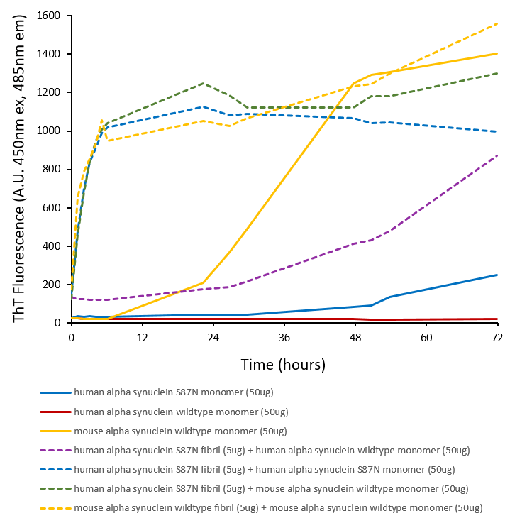 - Human alpha synuclein S87N mutant (HuS87N) has Ser87 mutated to the equivalent mouse residue Asn87, effectively making it a human-mouse chimeric protein. Despite sequence differences at only seven residues, or 5% of the total 140 amino acids, the aggregation rate of wild-type mouse A Alpha-syn (MsWT) is faster than wild-type human A Alpha-syn (HuWT) in vitro. In wild-type mouse models, MsWT fibrils are more efficient than HuWT fibrils at inducing endogenous mouse A Alpha-syn pathology (1). A53T or S87N substitutions in human A Alpha-syn substantially accelerate fibrilization rates in vitro (2,3). Chimeric HuS87N fibrils show enhanced induction of A Alpha-syn pathology greater than both HuWT and MsWT fibrils in mice neuron cultures (4). Therefore, HuS87N is a good construct for inducing robust endogenous A Alpha-syn seeding and pathology in wild-type mice/cultures.