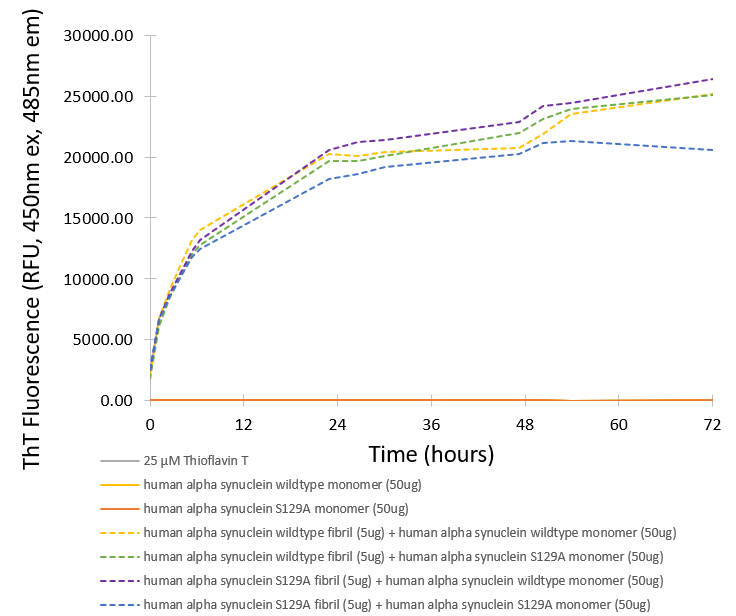 - Elevated levels of phosphoserine 129 (pS129) on alpha-synuclein has long been considered a hallmark of Parkinson's disease and other synucleinopathies, where up to 90% of alpha-synuclein deposition in Lewy Bodies contains pS129, compared to ≤4% in normal brains (reviewed in [1]). Further, pS129 was recently shown to function as a physiological regulator of neuronal activity (2). Alpha-synuclein S129A monomers and fibrils cannot be phosphorylated at position 129, and therefore can be utilized to study phospho-S129-independent biology and pathology. Further, this material can be used to confirm induction of endogenous pS129 pathology in disease models.