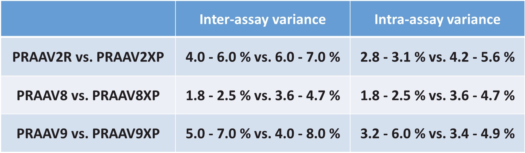 ** Intra-assay variance was tested using 3 different concentrations of AAV capsids in the range of the standard curve in 24-plex each